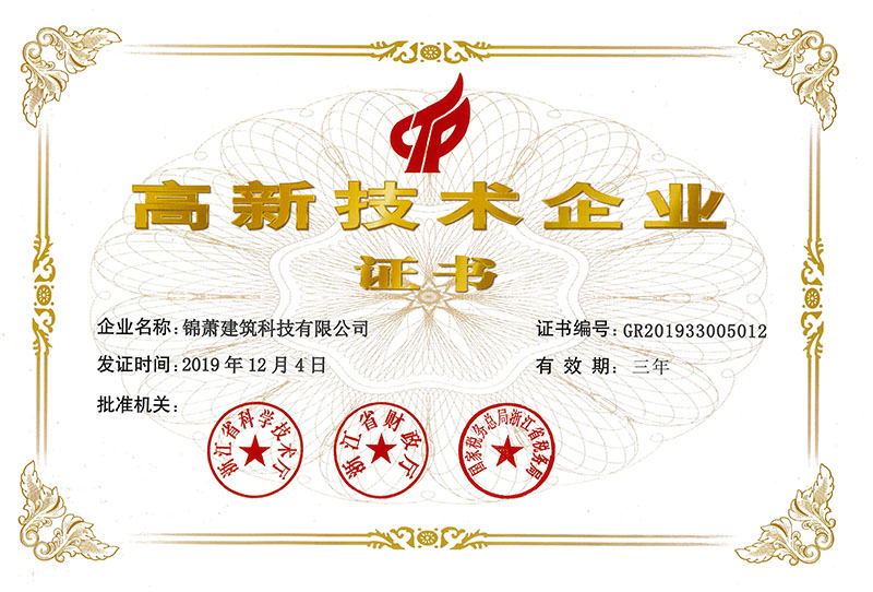 201912月,錦蕭建筑科技有限公司成功通過高新技術企業(yè)認定,并于近日收到由浙江省科學技術廳、浙江省財政廳及國家稅務總局浙江省稅務局頒發(fā)的“高新技術企業(yè)”證書。