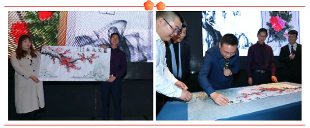 美女帥哥主持已經(jīng)是非常的養(yǎng)眼,優(yōu)美動聽的歌曲讓會場變得非常的溫馨。當(dāng)然最激動的還是現(xiàn)場作畫及競拍環(huán)節(jié),這幅由公司生產(chǎn)部員工姚玉磊現(xiàn)場創(chuàng)作,并蓋上了李軍董事長印章的《梅笑迎春》作品, 最后拍出了58000元。