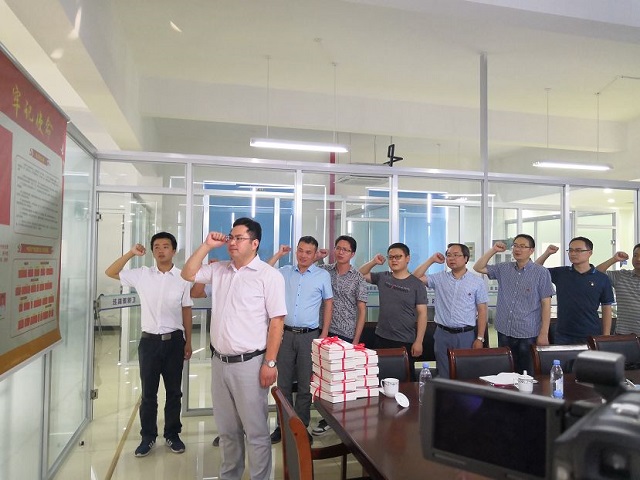 隨后,公司黨支部書記、副總經(jīng)理沈秋良帶領全體黨員重溫入黨誓詞,街道黨委委員繆李偉向公司黨支部全體黨員贈送黨徽和十九大學習資料,鼓勵全體黨員大力弘揚“紅船精神”,進一步引導黨員同志不忘初心,牢記使命,砥礪前行。