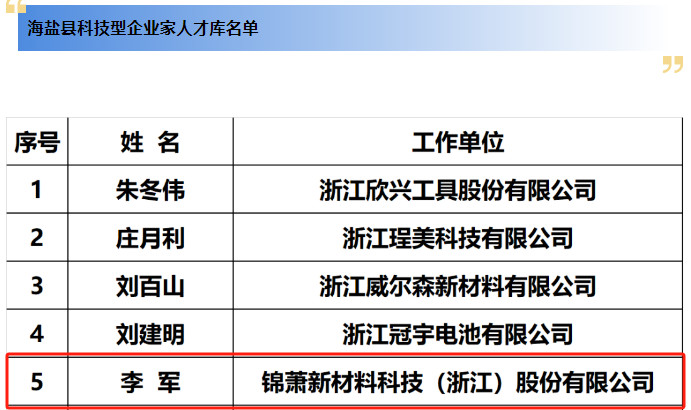 528日下午,嘉興海鹽圍繞“弘揚科學家精神,勇當高水平科技自立自強排頭兵”活動主題舉辦了系列主場活動,正式公布了海鹽縣科技型企業(yè)家人才庫名單、海鹽縣最具創(chuàng)新力青年科技型企業(yè)家人才庫名單,共25位優(yōu)秀企業(yè)家入庫,錦蕭科技董事長兼總經(jīng)理李軍榜上有名。