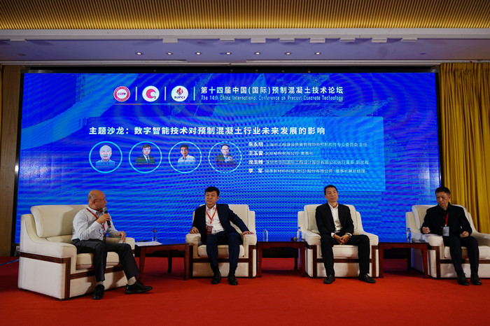 最后的主題沙龍環(huán)節(jié),上海市工程建設質(zhì)量管理協(xié)會預制構(gòu)件專業(yè)委員會主任朱永明,北京榆構(gòu)有限公司董事長王玉雷,深圳市華陽國際工程設計股份有限公司執(zhí)行董事、副總裁龍玉峰,錦蕭新材料科技(浙江)股份有限公司總工程師王建忠,4位專家圍繞“數(shù)字智能技術(shù)對預制混凝土行業(yè)未來發(fā)展的影響”這一主題,結(jié)合實戰(zhàn)經(jīng)驗,圍繞數(shù)智技術(shù)、綠色技術(shù)的發(fā)展對裝配式產(chǎn)業(yè)未來的影響,各抒己見,給出了中肯的意見和建議。