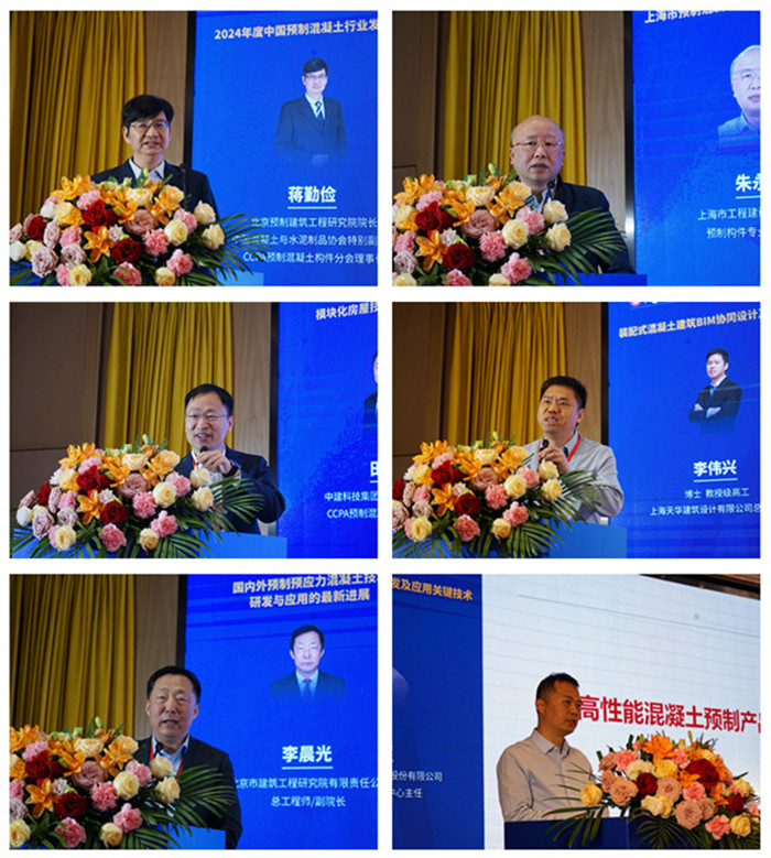 隨后的專家報告環(huán)節(jié),中國混凝土與水泥制品協(xié)會特別副會長、預制混凝土構(gòu)件分會理事長、北京預制建筑工程研究院院長蔣勤儉,上海市工程建設質(zhì)量管理協(xié)會預制構(gòu)件專業(yè)委員會主任朱永明,中建科技集團有限公司副總工程師、中國混凝土與水泥制品協(xié)會預制混凝土構(gòu)件分會秘書長田春雨,上海天華建筑設計有限公司總工程師李偉興,北京市建筑工程研究院有限責任公司總工程師、副院長李晨光,上海建工建材科技集團有限公司副總工程師、技術(shù)中心主任朱敏濤,分別作《2024年度中國預制混凝土行業(yè)發(fā)展報告》、《上海預制混凝土構(gòu)件行業(yè)創(chuàng)新與發(fā)展探索》、《模塊化房屋技術(shù)體系與工程應用》、《裝配式混凝土建筑BIM協(xié)同設計及案例分析》、《國內(nèi)外預制預應力混凝土技術(shù)研發(fā)與應用的最新進展》、《高性能混凝土預制產(chǎn)品開發(fā)及應用關(guān)鍵技術(shù)》的報告分享。